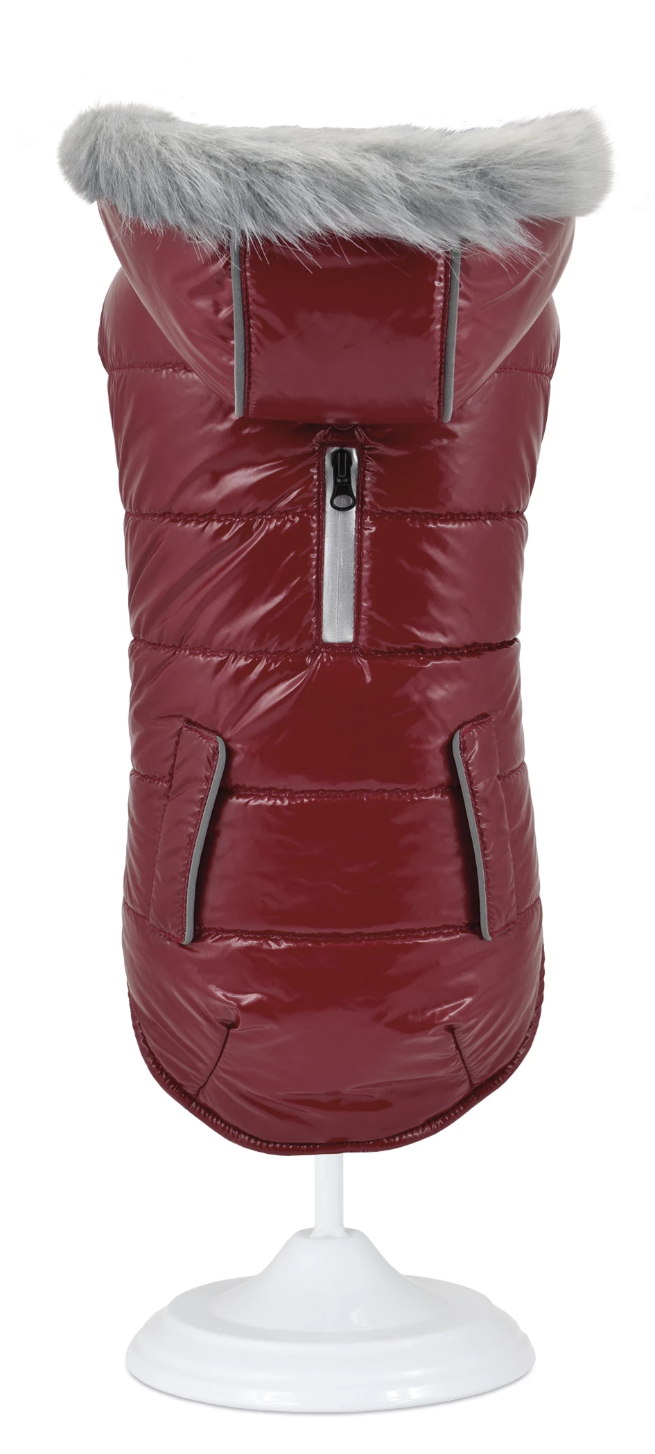 Veste en cuir verni à capuche amovible et déperlante. Avec doublure intérieure pour garder la chaleur. Avec oeillet pour la sangle avec fermeture éclair et élastique pour la queue (20x17x1,5cm).