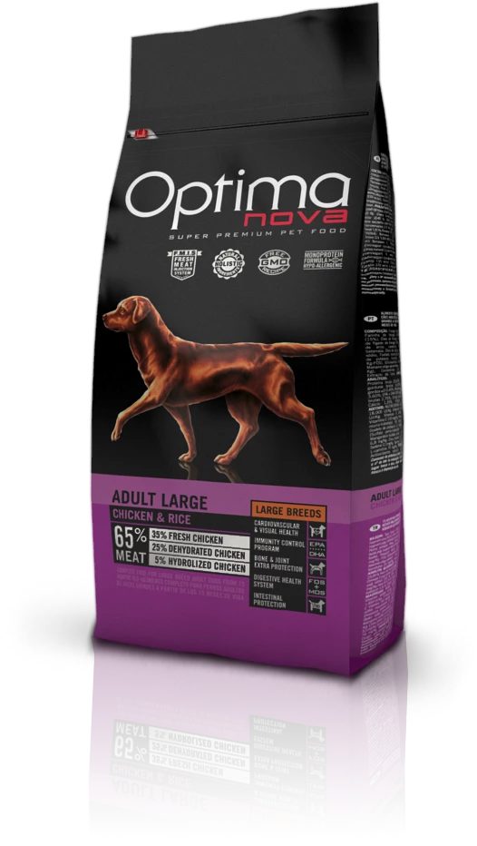 Grâce à l’ajout de glucosamine et de chondroïtine, Optimanova Adult Large Chicken & Rice est spécialement formulé pour prévenir les dommages prématurés aux os et aux articulations, fréquents chez les grandes races. La teneur optimale en EPA et DHA favorise la digestion et renforce le système immunitaire, et grâce à l’inclusion de pulpe de betterave, améliore la consistance des selles.