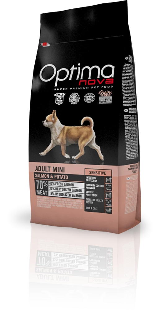 La recette d’Optimanova Adult Mini Sensitive Salmon & Potato est parfaite pour toutes les petites ou mini races, en particulier celles qui ont une digestion sensible ou qui nécessitent des soins supplémentaires pour la peau et le pelage. Le saumon, en tant que seule source de protéines, protège contre les éventuelles allergies et intolérances alimentaires. La combinaison de zinc, de vitamine A, de biotine et d’acides gras oméga-3 et oméga-6 favorise la beauté et la santé de la peau, du pelage et des muqueuses. En outre, le gingembre stimule la production d’enzymes digestives, facilitant ainsi l’absorption des nutriments.