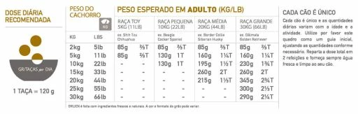 Ce régime complet pour chiots est basé sur de la viande de volaille comme la dinde et le poulet, et comprend également du poisson comme le hareng et le saumon, des œufs, des légumes, des fruits et des légumineuses, fournissant ainsi tous les nutriments nécessaires à votre chien jusqu’à l’âge d’un an.