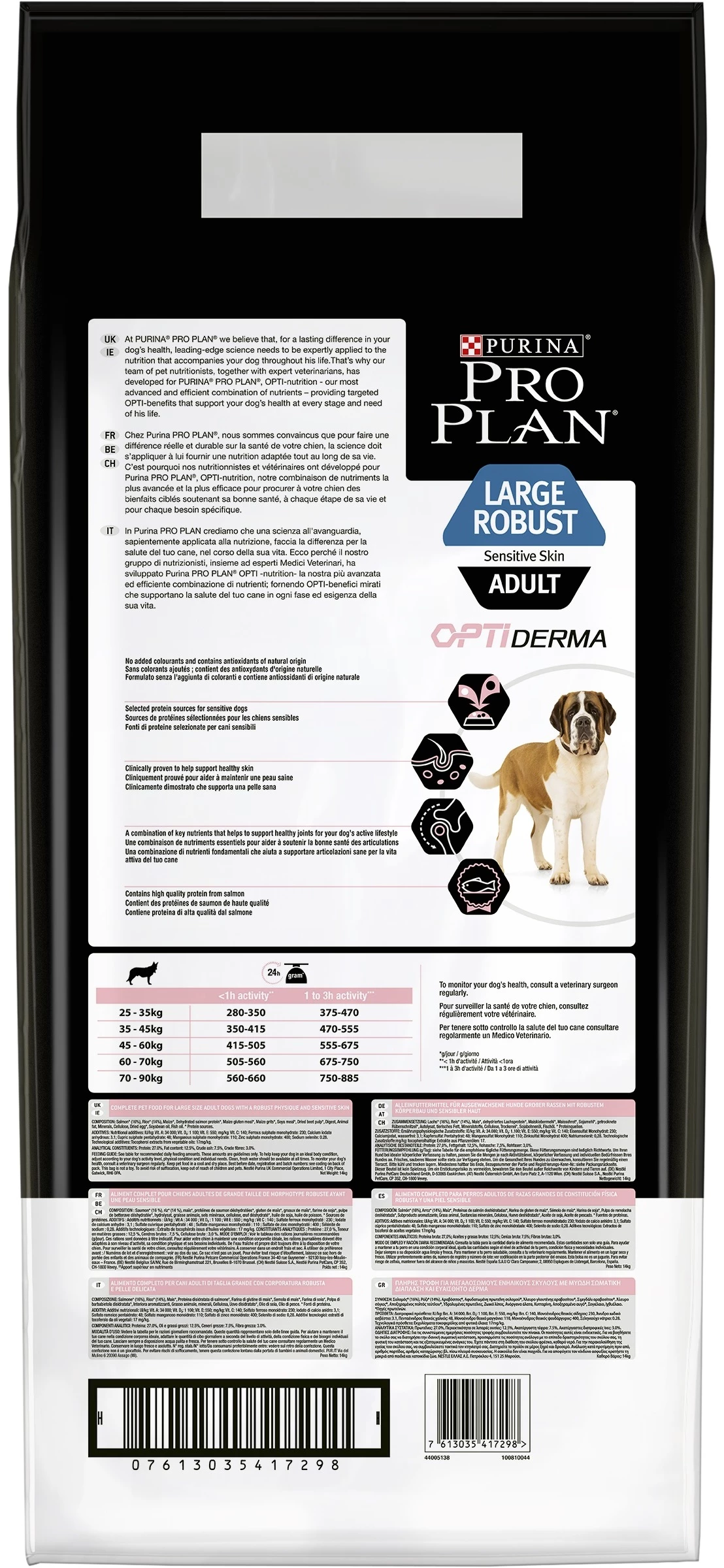 PURINA® PRO PLAN® Large Robust Adult sensitive skin avec OPTIDERMA® riche en saumon est un aliment sec complet pour les grands chiens robustes à la peau sensible.