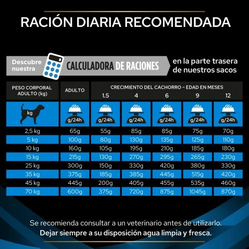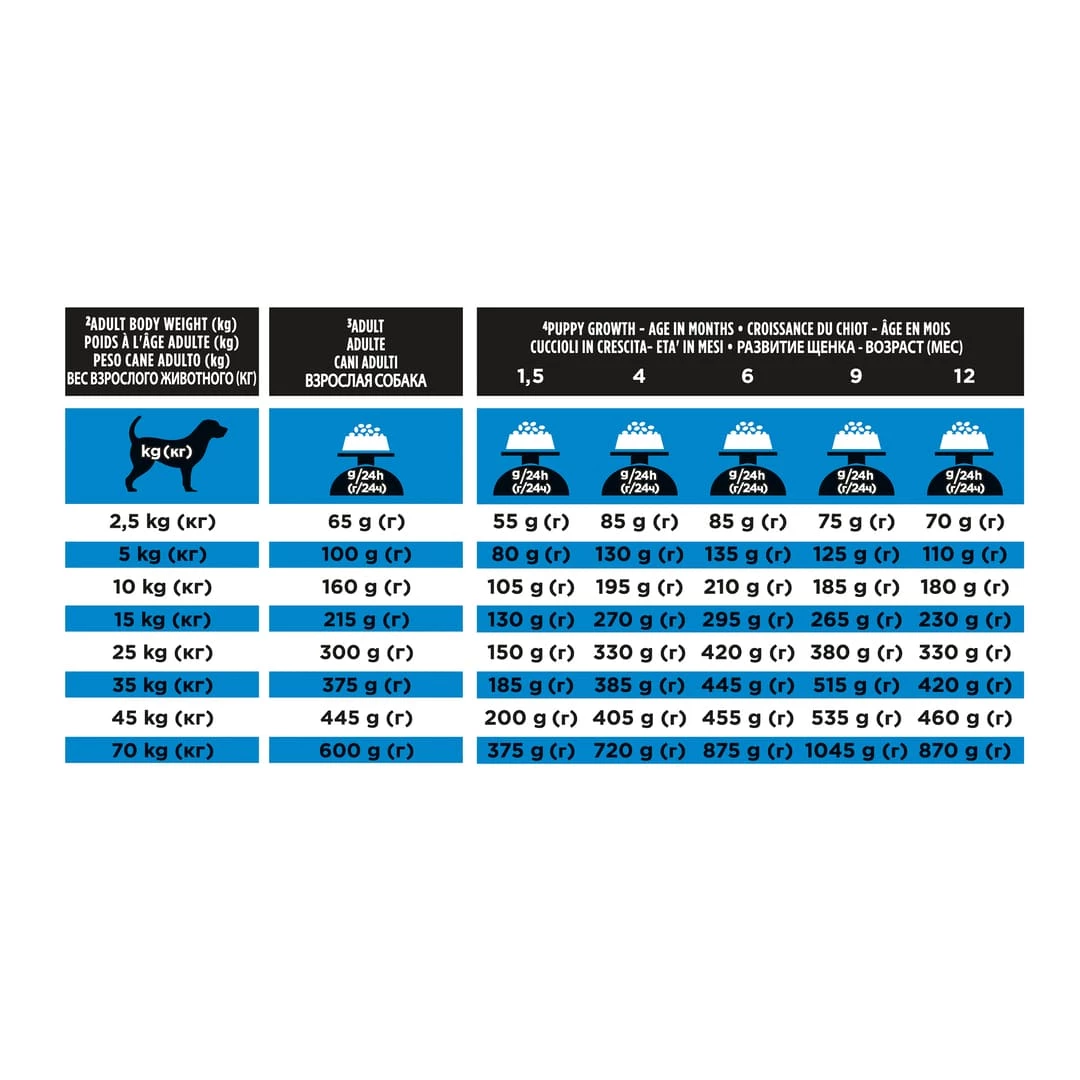 Consultez le tableau pour connaître la quantité de nourriture quotidienne recommandée. Ces montants ne sont qu’indicatifs. Pour aider à maintenir votre chien dans une condition physique idéale, ajustez les quantités en fonction du niveau d’activité de votre chien, de sa condition physique et de ses besoins individuels. Proplan conseille de toujours laisser de l’eau propre et fraîche à disposition. Pour garder votre chien en bonne santé, consultez régulièrement votre vétérinaire.