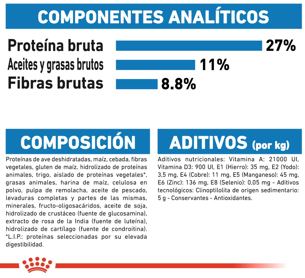 Une teneur élevée en protéines* (27%) aide à maintenir la masse musculaire et une faible teneur en graisses* (11%) permet de limiter la prise de poids. Une combinaison optimale de fibres solubles et insolubles vous permettra de vous sentir rassasié, tandis que les acides gras oméga favorisent le bon fonctionnement des articulations. Une alimentation complète, appétissante et rassasiante qui permet à votre chien de rester mince et à ses articulations d’être en bonne santé.