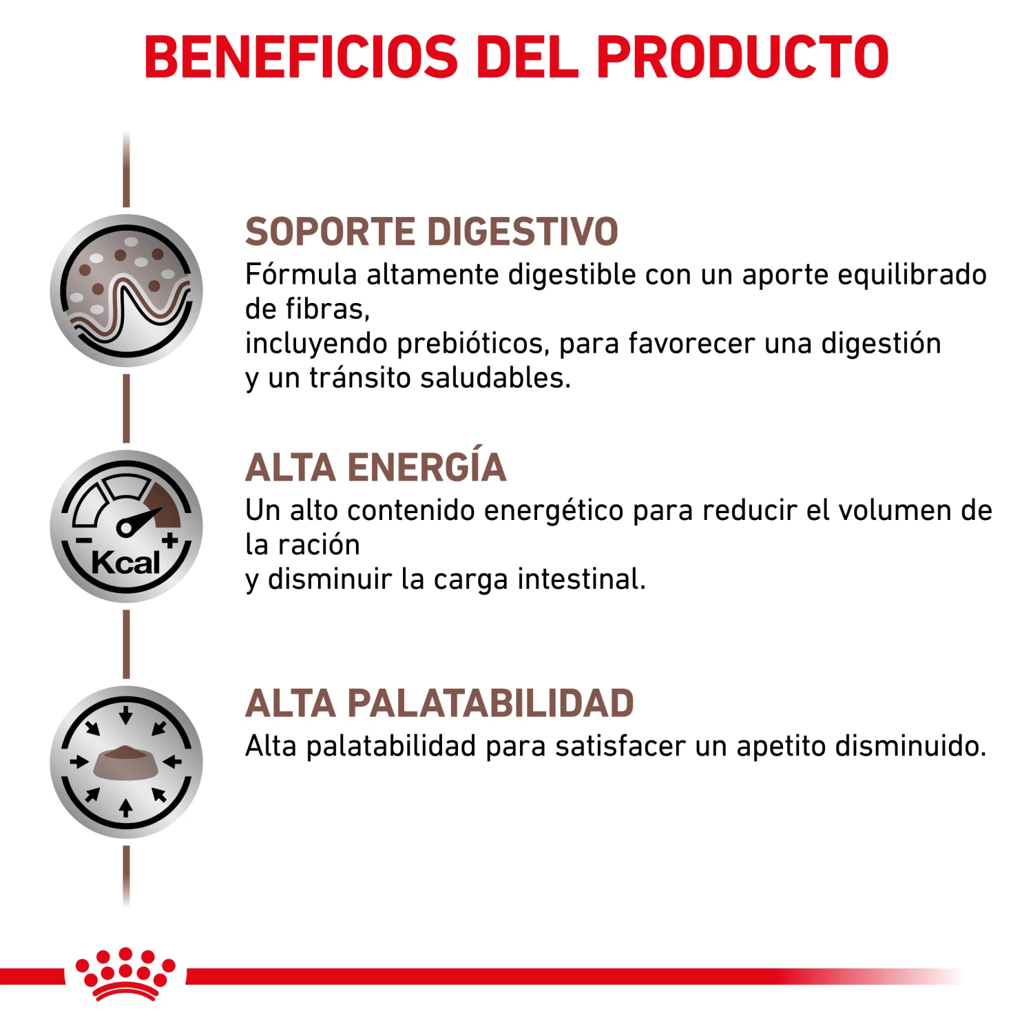 Bienfaits clés de Royal Canin Gastro-intestinal : Haute énergie : Il Répond aux besoins énergétiques (maintien, convalescence) et permet de réduire le volume de la ration, ce qui réduit également la charge digestive.