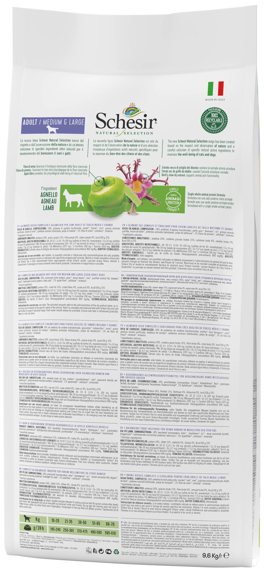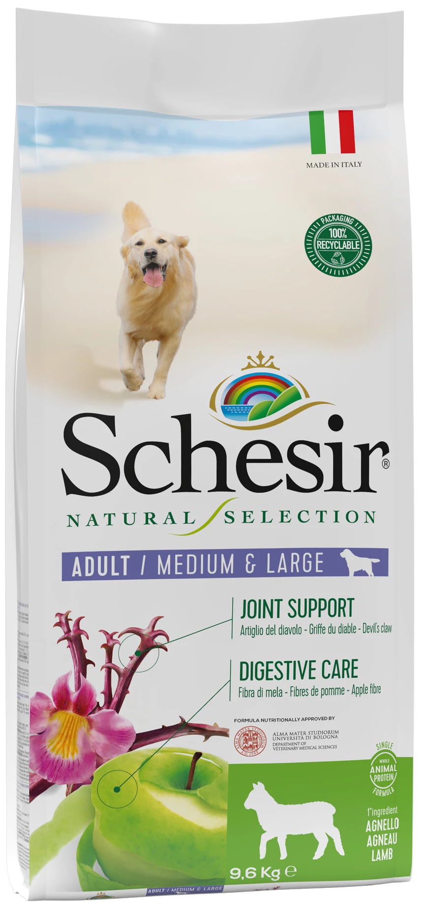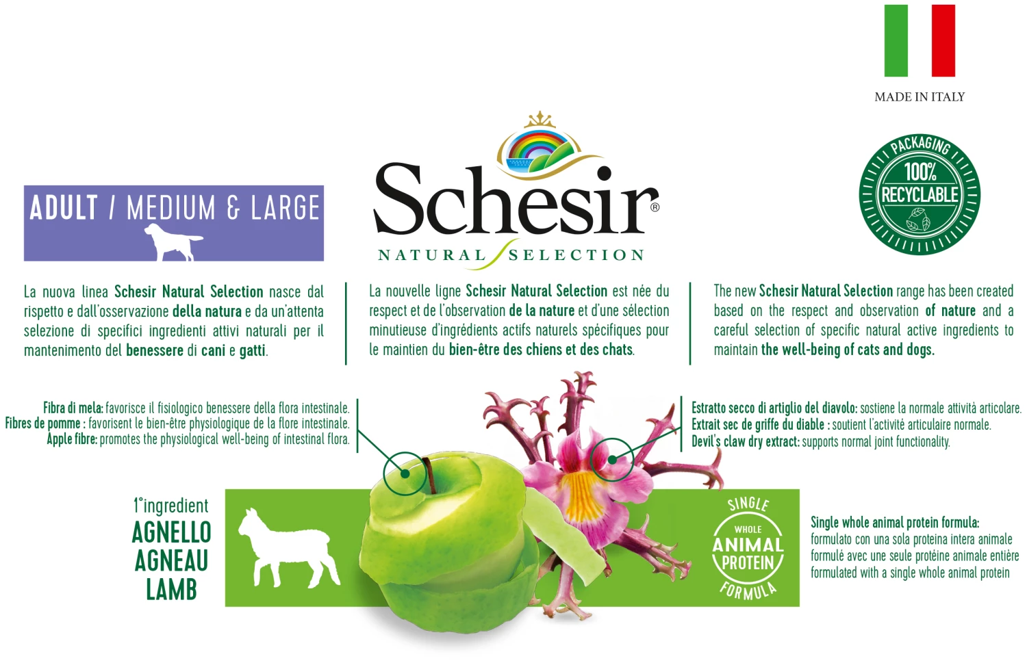 Schesir Natural Selection – Aliment complet et équilibré pour chiens adultes de taille moyenne et grande, riche en agneau, avec une seule protéine animale, pour le bien-être intestinal et le soutien des articulations