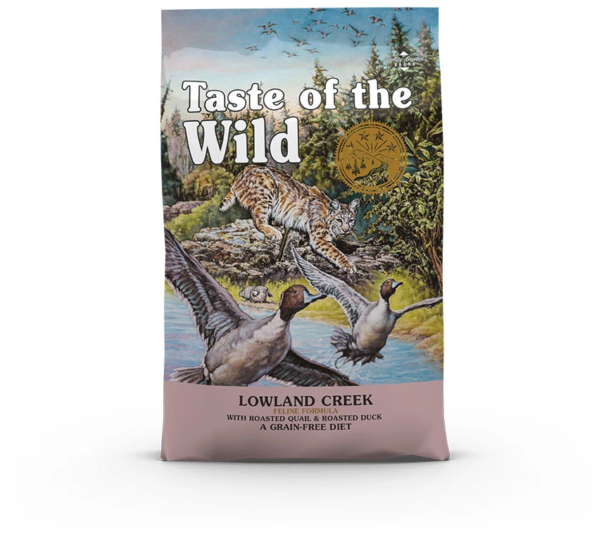 Taste of the Wild Lowland Creek est une nourriture pour chats convenant à toutes les étapes de la vie. Composé de caille et de canard, qui sont des protéines hautement digestibles, il contient des probiotiques spécifiques à chaque espèce pour un soutien digestif et immunitaire, de la taurine pour un cœur et des yeux sains, et des antioxydants provenant de légumes, de légumineuses et de fruits pour un bien-être général.