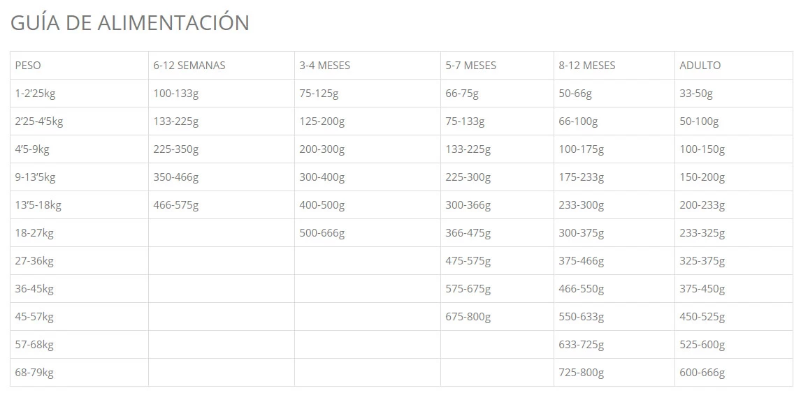 Le changement d’alimentation doit se faire progressivement sur 7 jours. Donnez la ration quotidienne en 2 ou 3 portions réparties dans la journée. La quantité de nourriture peut varier en fonction de l’activité, de la race du chien et des conditions environnementales. Le chien doit toujours avoir de l’eau propre et fraîche à sa disposition. Conserver dans un endroit frais et sec.