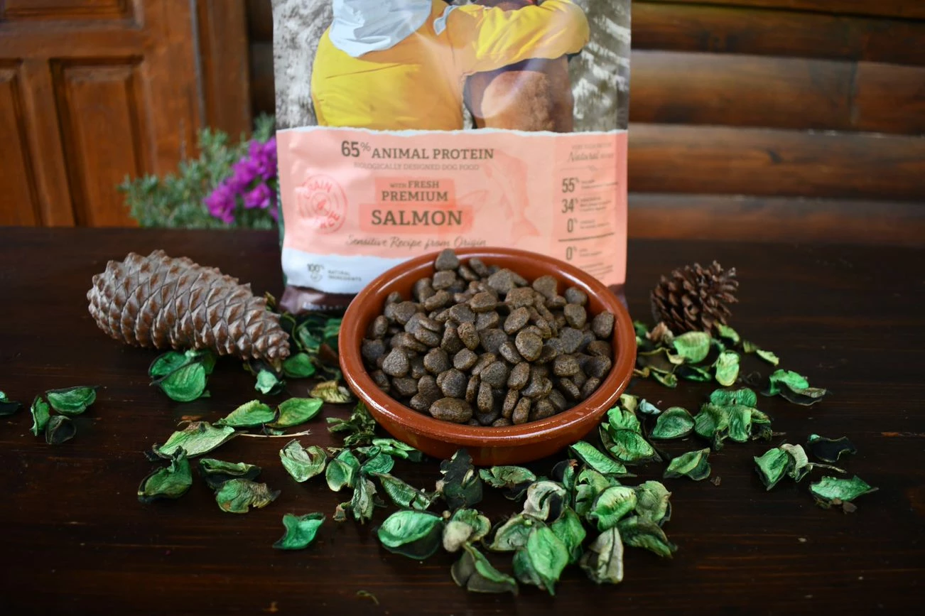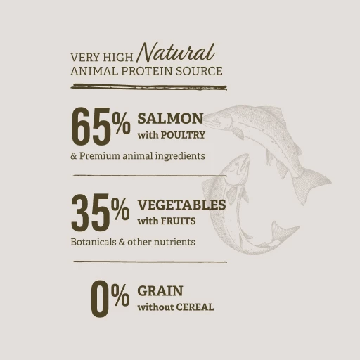 Le premier ingrédient est le saumon frais (33%) qui, combiné au saumon déshydraté, constitue 65% des croquettes. En outre, celles-ci constituent un aliment hypoallergénique et monoprotéique qui réduit et prévient toute possible réaction allergique liée à l’alimentation car il ne contient pas de céréales et le saumon constitue un aliment contenant des propriétés spécifiques pour les chiens les plus sensibles. Toutes les propriétés et vitamines qui y sont contenues les aideront à renforcer le système immunitaire pour faire face à toute menace qui affecte son bien-être et les garder forts et en bonne santé.