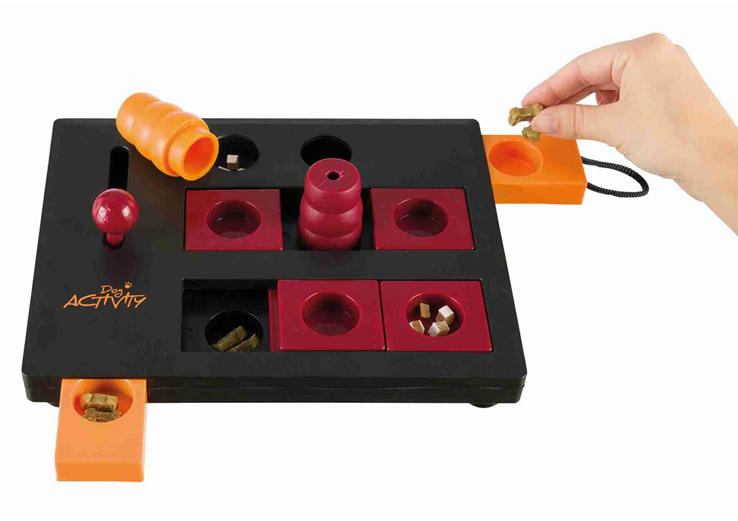– Jeu d’expert : le chien doit déplacer les cônes et les pièces coulissantes afin d’obtenir les friandises.