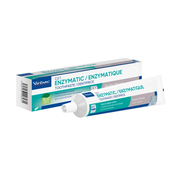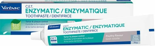 Le dentifrice enzymatique Virbac est spécialement développé pour les chiens et les chats. Le brossage quotidien des dents est le moyen le plus efficace de prévenir les problèmes dentaires chez votre animal. Il contient un système enzymatique breveté, C.E.T. the enzyme system (glucose oxydase, lactoperoxydase, thiocyanate de potassium), qui aide à contrer la formation de la plaque et du tartre. Le dentifrice contient également un abrasif, qui renforce l’effet de nettoyage mécanique. Il ne contient pas de fluorure. Le dentifrice Virbac a un goût de poulet pour faciliter le brossage des dents de votre animal. Un brossage régulier des dents permet de prévenir l’accumulation de la plaque dentaire sur les dents de votre chien ou de votre chat. Appliquez du dentifrice sur la brosse à dents, puis brossez doucement les dents de votre animal. Pas besoin de rincer après le brossage.